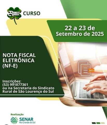 Curso Gratuito: Nota Fiscal Eletrônica (NF-e)Nos dias 22 e 23 de setembro, o Sindicato Rural de São Lourenço do Sul, em parceria com o Senar-RS, promove um curso essencial para quem precisa emitir, entender e organizar as obrigações fiscais no setor rural e empresarial. 📚 Conteúdo Programático:✅ O que é a Nota Fiscal Eletrônica (NF-e)✅ […]