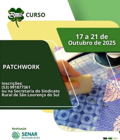 De 17 a 21 de outubro de 2025, acontece no Sindicato Rural de São Lourenço do Sul o Curso de Patchwork, em parceria com o Senar.Uma oportunidade incrível para quem deseja desenvolver habilidades na costura criativa e produzir peças únicas e funcionais. 📌 Conteúdo Programático✅ Importância econômica e pessoal da confecção em Patchwork✅ Vocabulário e […]