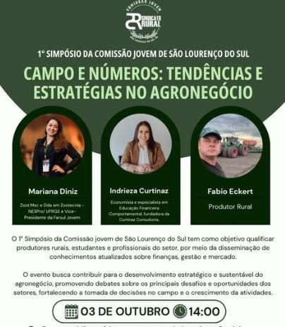 Com o tema “Campo e Números: Tendências e Estratégias no Agronegócio”, o encontro vai reunir especialistas e produtores para debater os principais desafios e oportunidades do setor, trazendo conteúdos sobre gestão, finanças e mercado. 📅 03 de outubro🕑 14h📍 Restaurante da Associação Rural de São Lourenço do Sul, durante a 44ª Expofeira